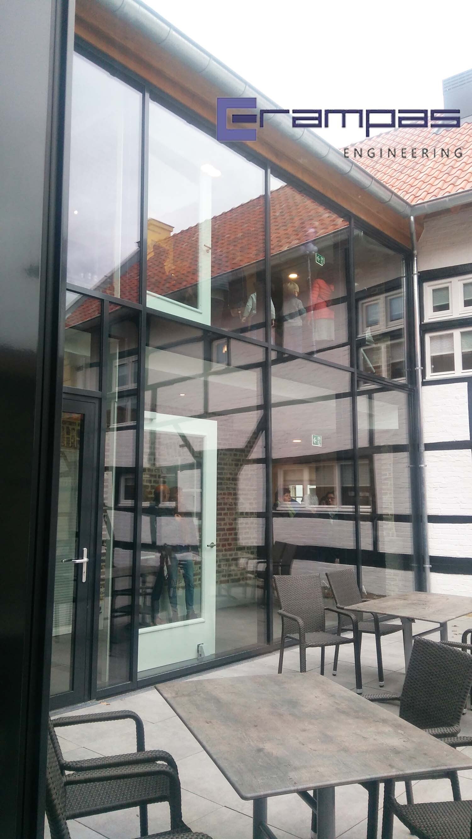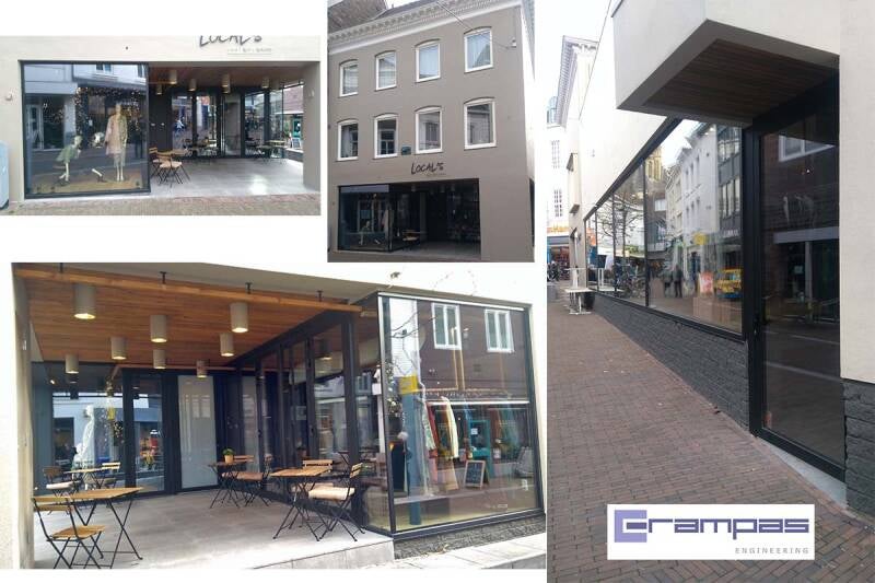 Entreepartij winkel/restaurant in Sittard : structurele glasruiten en aluminium kozijnen uitwerken voor productie en montage.